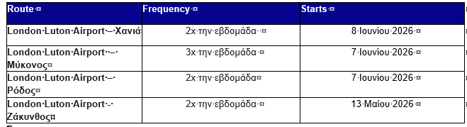 Η αεροπορική εταιρεία θα προσφέρει πλέον απευθείας πτήσεις προς Μύκονο, Ρόδο, Ζάκυνθο και Χανιά, παρέχοντας περισσότερες επιλογές ταξιδιού μεταξύ Ηνωμένου Βασιλείου και Ελλάδας, καθώς και για Κύπριους ταξιδιώτες που συνδέονται μέσω Λονδίνου.