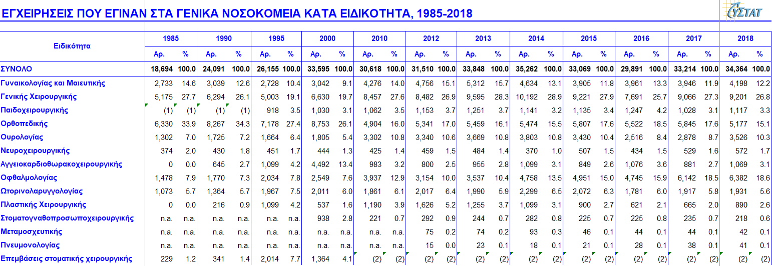 Σύμφωνα με τα πιο πρόσφατα στατιστικά στοιχεία, το 2018 καταγράφτηκαν στο σύνολό τους 34.364 χειρουργικές επεμβάσεις, ενώ οι περισσότερες καταγράφτηκαν το έτος 2014 (35.262 επεμβάσεις).